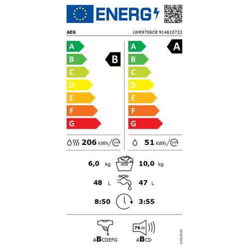 De AEG LWR9706C8 behoort tot energieklasse B, een uitstekende score voor een was-droogcombinatie met deze capaciteit. Dit betekent efficiënter wassen en drogen, zonder concessies aan prestaties.