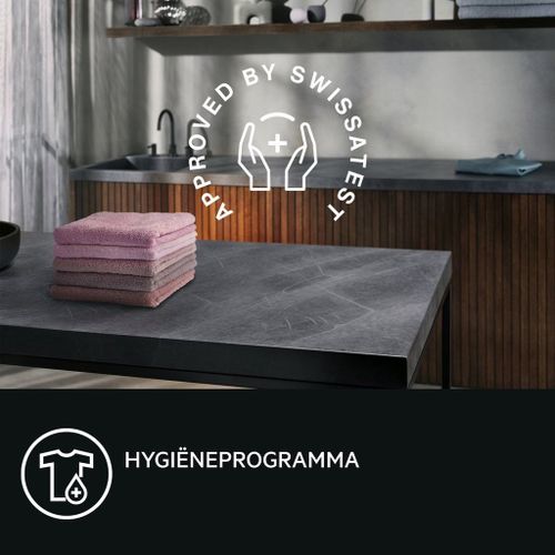 Het door Swissatest gecertificeerde hygiëneprogramma droogt en ontsmet je wasgoed op meer dan 60 °C en verwijdert 99,9% van de bacteriën en virussen. Nu kun je met vertrouwen dekbedden, kussens en kleding drogen.