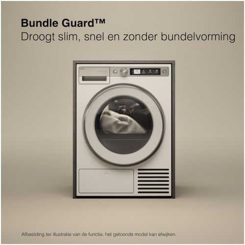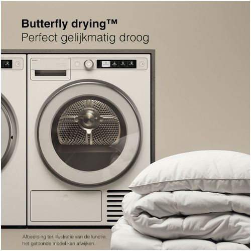 Het wasgoed beweegt in een achtvormig patroon door de trommel. Zo blijft de lading luchtig en kan warme lucht elk stuk bereiken, wat bijdraagt aan consistente droging en minder kreukvorming.